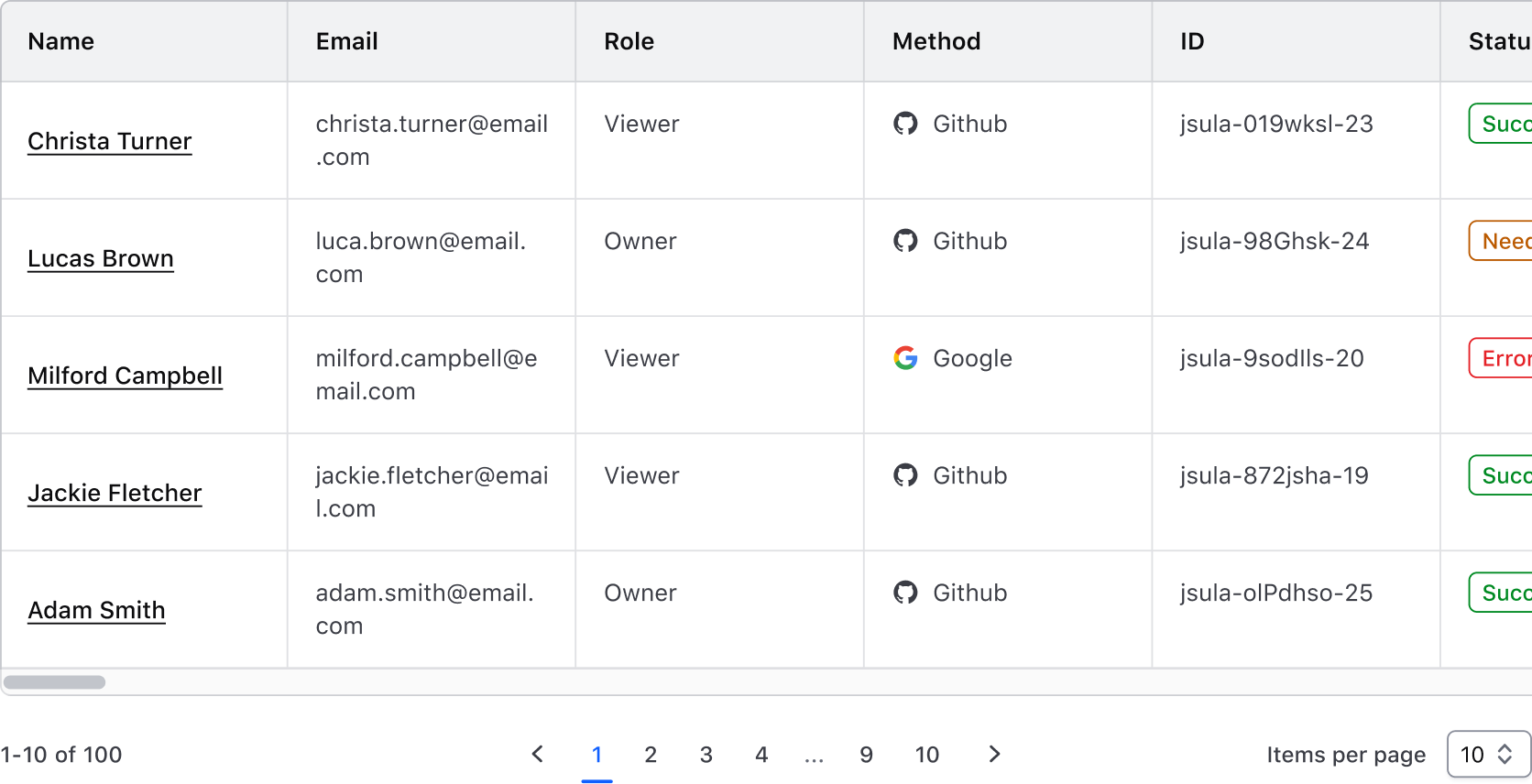 Unlike the Table component, each cell receives focus in the Advanced Table to support users navigating through the table efficiently with a keyboard. For any other interactions, you must use interactive elements (buttons, links, etc.) within the cells.